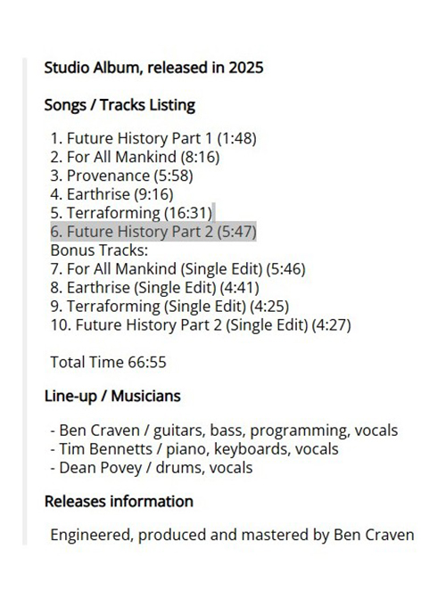 Attachment 2300 ABOUT AMBIENT DEN .AMBIENT DEN from progarchives.com Ambient Den biography AMBIENT DEN is a progressive rock project by multi-instrumentalist Ben CRAVEN, keyboardist/vocalist Tim BENNETTS (SEVEN DAY MASK, SUB INC), and drummer Dean POVEY (FRANKENFIDO), all from Australia. Tim originally met Ben in 2017, and after a couple of informal jams they discussed the idea of writing some music together, which began in earnest in December 2018. Ben had already played with Dean previously in his other band FRANKENFIDO, and the three of them joined forces in the summer of 2022 to play at a corporate gig that Dean had committed to. During their rehearsals of the intended setlist of cover songs, they took time out to work on some music that Tim and Ben had already written, and they soon became convinced that the material was worth developing into an album. The name AMBIENT DEN is actually an anagram of 'Tim', 'Ben', and 'Dean', though Tim and Ben had originally performed under the name PROGAUSTRALIS - with their first gig as a duo being on Friday 5th July 2019 at the Junk Bar, Ashgrove, Brisbane - but what had initially started out as a series of experimental jam sessions between CRAVEN and BENNETTS had now evolved into a full-fledged band project, with all three members sharing common influences of the great prog bands of the 1970s, such as YES, GENESIS and PINK FLOYD. AMBIENT DEN's self-titled debut album is based on a concept that tells the story of mankind's search for a new home amongst the stars, culminating in the creation of a distant and inhabitable new world. The album was produced by Ben CRAVEN, and his trademark influences on the overall sound can be easily heard, but the songwriting was a collaborative effort involving all three band members. The album consists of six main tracks and four single edits, and there is a strong PINK FLOYD feel to the music throughout. It was released via Desert Comb Music on 28th July 2025. Attachment 2299 These are my best tracks of 2025 Track Title-Group or Artist-Album King Kong-AMPLIFIER-Gargantuan Night Terror-DREAM THEATER-Parasomnia Panopticon -GHOST OF THE MACHINE-Empires Must Fall The End of Days Suite: 1. The City Lights at Twilight -THE JOHN IRVINE BAND-HERE COME THE ROBOTS! Lucifer, Bringer of Light -MOTORSPSYCHO-MOTORSPSYCHO Marvelous World-CHEAT THE PROPHET-Redemption The-Shoreline-EYE 2 EYE-Lost Horizon End of the Road-KARMAKANIC-Transmutation These Hands That Build-BLACK NARCISSUS-There Lingers One Who's Long Forgotten Objects Outlive Us-STEVEN WILSON-The Overview Far From Here-IQ-Dominion Sleeping on a Cloud-LET SEE THIN-Machine Called Life Gone-BJØRN RIIS-Fimbulvinter Deep Water Suite IX-COSMIC CATHEDRAL- Deep Water Another Holy Grail-PATTERN-SEEKING ANIMALS-Friend Of All Creatures Seraphina Moon-CEN-PROJEKT-Carnival Of Lost Souls Demain a l’aube-GERALD MASSOIS- Demain a l’aube -Considerations-THE FLOWER KINGS-Love -The Passing-JACOB ROBERGE-The Passing -Ordinary Gods-KARIBOW-PanTerrania -Division Warning-COSMOGRAF-The Orphan Epoch -De Tre Gratier-Lars Fredrik Froislie-Gamle Mester -Terraforming-AMBIENT DEN-Ambient Den Attachment 2301 Attachment 2302 Terraforming-AMBIENT DEN https://www.youtube.com/watch?v=lIKwxJ4YdEU GOOD LISTENING |