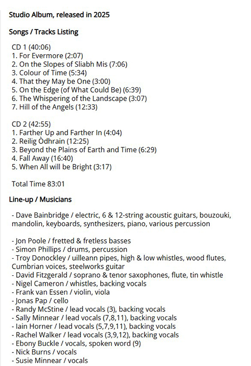 Attachment 2305 ABOUT DAVE BAINBRIDGE .DAVE BAINBRIDGE from official website Co-founder of Celtic progressive/folk/rock/band IONA, with whom he toured the world and released 13 critically acclaimed albums, Dave’s multi-faceted career as a solo artist, keyboardist, guitarist, bouzouki player, composer, improviser, producer, arranger and sound mixer has led him into many musical genres and work with numerous artists including Strawbs, Lifesigns, Troy Donockley, Jack Bruce, Buddy Guy, Nick Beggs, Gloria Gaynor, Moya Brennan, Colin Blunstone, Downes Braide Association, Robert Fripp, Phil Keaggy, Paul Jones, The Norman Beaker Band, Damian Wilson, Nick Fletcher, ‘Snake’ Davis, Adrian Snell, PP Arnold, Mollie Marriott, Dave Kerzner and many others. Winner of the BBC Radio 2 Best Jazz soloist award (piano) and the Sam Hood Rosebowl for Outstanding Performance during his time at Leeds Music College (where he graduated with a first class pass, including distinction in arranging), Dave has composed soundtracks for numerous short films, TV and multimedia productions and has co-written a guitar concerto with Classic FM favourite Nick Fletcher. Current live projects include duo concerts with singer / multi instrumentalist Sally Minnear. Dave is also keyboardist for the legendary Zombies singer Colin Blunstone and guitarist/keys player for Lifesigns (featuring John Young). Dave has released four solo albums. 'Veil of Gossamer' (2004), ‘Celestial Fire’, (2014), ‘The Remembering’ (2016) and 'To The Far Away' (2021). His fifth solo album 'On the Edge (of what could be)' is due for release mid 2025. There have also been several collaborative albums and DVD releases with both Troy Donockley (Nightwish) and David Fitzgerald (Iona co-founder). The Celestial Fire band 'Live in the UK' dvd/2cd was released in 2017, and 'Live in the Studio', his first release with Sally Minnear was released in 2018. When not touring, Dave spends his time recording, producing, mixing and writing. He has produced 12 albums for Iona, all his own solo and collaborative albums, and projects for several other artists in genres ranging from acoustic jazz through classical guitar to progressive rock. Attachment 2308 These are my best tracks of 2025 Track Title-Group or Artist-Album King Kong-AMPLIFIER-Gargantuan Night Terror-DREAM THEATER-Parasomnia Panopticon -GHOST OF THE MACHINE-Empires Must Fall The End of Days Suite: 1. The City Lights at Twilight -THE JOHN IRVINE BAND-HERE COME THE ROBOTS! Lucifer, Bringer of Light -MOTORSPSYCHO-MOTORSPSYCHO Marvelous World-CHEAT THE PROPHET-Redemption The-Shoreline-EYE 2 EYE-Lost Horizon End of the Road-KARMAKANIC-Transmutation These Hands That Build-BLACK NARCISSUS-There Lingers One Who's Long Forgotten Objects Outlive Us-STEVEN WILSON-The Overview Far From Here-IQ-Dominion Sleeping on a Cloud-LET SEE THIN-Machine Called Life Gone-BJØRN RIIS-Fimbulvinter Deep Water Suite IX-COSMIC CATHEDRAL- Deep Water Another Holy Grail-PATTERN-SEEKING ANIMALS-Friend Of All Creatures Seraphina Moon-CEN-PROJEKT-Carnival Of Lost Souls Demain a l’aube-GERALD MASSOIS- Demain a l’aube -Considerations-THE FLOWER KINGS-Love -The Passing-JACOB ROBERGE-The Passing -Ordinary Gods-KARIBOW-PanTerrania -Division Warning-COSMOGRAF-The Orphan Epoch -De Tre Gratier-Lars Fredrik Froislie-Gamle Mester -Terraforming-AMBIENT DEN-Ambient Den -Fall Away-DAVE BAINBRIDGE-On The Edge (Of What Could Be) Attachment 2306 Attachment 2307 While waiting for an address to listen to the chosen track, I'll post a promo video of the whole album and in any case the track can also be requested on Aural Moon On The Edge (of what could be) promo-DAVE BAINBRIDGE https://www.youtube.com/watch?v=JMiF...tart_radio =1 GOOD LISTENING |