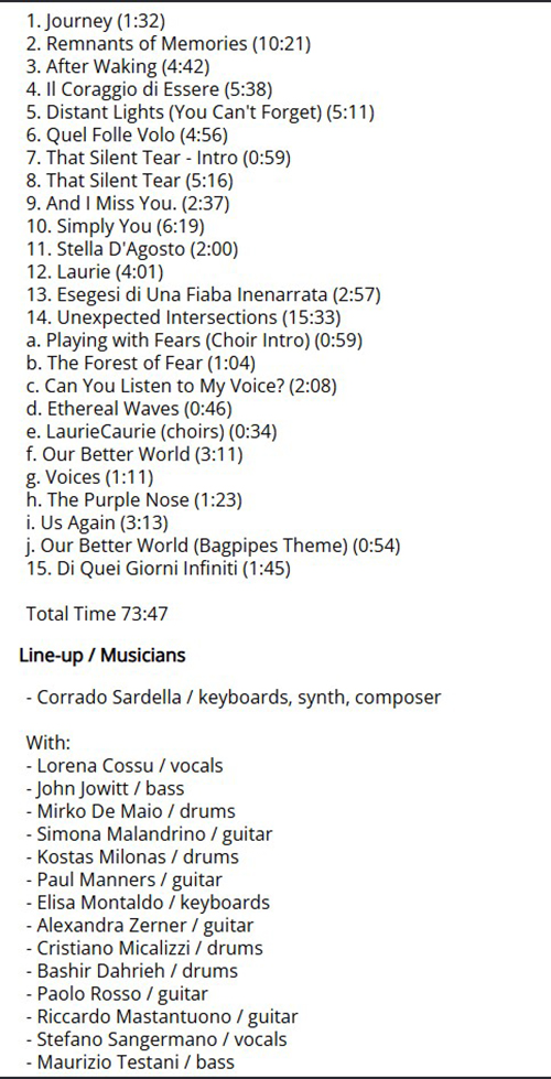 Attachment 2310 ABOUT DORACOR .DORACOR from progarchives.com Doracor biography Founded in Rome, Italy in 1995 - Still active as of 2016 DORACOR is an anagram/pseudonym for keyboardist and drummer Corrado SARDELLA. Segni Premonitori (1998) and Antiche Impressioni (1999) are the 2nd and 3rd Doracor albums. These are high-caliber, primarily-instrumental symphonic rock albums, with Corrado handling most of the instruments himself, with assistance from guest musicians. These have a very full-band sound and a 1970's orientation. The best way to think of them is as the albums Tony Banks could make if Tony made progressive rock solo albums instead of trying to match the chart success of Phil Collins and Mike Rutherford. Antiche Impressioni features a female vocalist, a bassist and a guitarist, while Segni Premonitori features a male singer and a guitarist. "Transizione" (2001) trumps the earlier albums, as here Sardella is aided by seven other musicians, and the sound is that of a full band, with male and female vocals in Italian. It is one of the best symphonic progressive albums that no one has heard and is quite similar to the first album by the French band HECENIA. Though it does have most of the hallmarks of the Italian 1970's romantic progressive style, it is even more influenced by GENESIS circa "Wind and Wuthering", while at times the energy level suggests later bands such as IQ. "Evanescenze" (2005) continues in this vein but is even better. Just male vocals this time around, but they are very strong, reminding one of ATON's or even LOCANDA DELLE FATE at times." Thanks to Larry Kolota of Kinesis Progressive Rock CDs for permission to reproduce this bio. Visit Larry's Attachment 2309 These are my best tracks of 2025 Track Title-Group or Artist-Album King Kong-AMPLIFIER-Gargantuan Night Terror-DREAM THEATER-Parasomnia Panopticon -GHOST OF THE MACHINE-Empires Must Fall The End of Days Suite: 1. The City Lights at Twilight -THE JOHN IRVINE BAND-HERE COME THE ROBOTS! Lucifer, Bringer of Light -MOTORSPSYCHO-MOTORSPSYCHO Marvelous World-CHEAT THE PROPHET-Redemption The-Shoreline-EYE 2 EYE-Lost Horizon End of the Road-KARMAKANIC-Transmutation These Hands That Build-BLACK NARCISSUS-There Lingers One Who's Long Forgotten Objects Outlive Us-STEVEN WILSON-The Overview Far From Here-IQ-Dominion Sleeping on a Cloud-LET SEE THIN-Machine Called Life Gone-BJØRN RIIS-Fimbulvinter Deep Water Suite IX-COSMIC CATHEDRAL- Deep Water Another Holy Grail-PATTERN-SEEKING ANIMALS-Friend Of All Creatures Seraphina Moon-CEN-PROJEKT-Carnival Of Lost Souls Demain a l’aube-GERALD MASSOIS- Demain a l’aube -Considerations-THE FLOWER KINGS-Love -The Passing-JACOB ROBERGE-The Passing -Ordinary Gods-KARIBOW-PanTerrania -Division Warning-COSMOGRAF-The Orphan Epoch -De Tre Gratier-Lars Fredrik Froislie-Gamle Mester -Terraforming-AMBIENT DEN-Ambient Den -Fall Away-DAVE BAINBRIDGE-On The Edge (Of What Could Be) -Remnants of Memories-DORACOR-Unexpected Intersections Attachment 2311 Attachment 2312 Remnants of Memories-DORACOR https://doracor-ams.bandcamp.com/tra...ts-of-memories GOOD LISTENING |