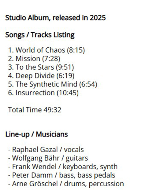Attachment 2314 ABOUT CRAYON PHASE .CRAYON PHASE from official website About CRAYON PHASE is a progressive rock band from the ruhr area and was formed in 2008 by Frank Wendel (vocals, keys), followed by Wolfgang Bähr (guitar, bass) , Arne Gröschel (drums) and Frank Brommer (keys). Peter Damm (bass) joined in 2012 after the recording of their debut album “Within my Recollection”, which was released in 2013. Frank Brommer left the band in 2015 and Frank Wendel focused on keys only when they started to write the songs for their second album. In 2019 the second album “Two hundred pages” was released as a concept album. Each song reflects the spirit of the individual chapters and takes you through the story with atmospheres changing from dark to epic, from catchy to deep, from mystic to aggressive, but still stays tight and cohesive as one piece of music. The band developed towards a more energetic progressive rock sound, with their own blend of Neo Prog, New Art Rock and Melodic Prog Metal by utilizing the experience the members gained over the years in a number of different projects. While searching for a new vocalist the vocal lines and lyrics for the new songs had to be created by Wolfgang Bähr with some support from Frank Wendel. Finally the band found Raphael Gazal on vocals for the recording of the album, whose strong and variable voice supports the new songs and the musical development of the band very well. Unfortunately Raphael was not available to join as a long term band member so the search went on to find a permanent singer for the band.. After the release of “Two Hundred Pages” and many good (also international) reviews also in well-known German print prog magazines like “Ecplipsed” or “Empire”, the plan was to look for a live singer to bring our music finally on stage. But unfortunately the search for a singer became more and more difficult because COVID-19 arrived and caused massively and worldwide lockdowns. So we started working on new songs in our home studios because it seemed neither concerts nor rehearsals were possible for a long time. The final recordings of the third album were done in middle of 2025 and our focus has once again been on studio work. Therefore also Raphael will be part again as the main singer, that means also no line-up changes in terms of the strong album before. The new album will be called “Synthetic Mind” and contains all known musical elements of the Crayon Phase sound like complex structures and cinematic arrangements, but also some straighter and more energetic parts with heavy Guitars and massive Keys. It was released on 30th September as digital album and because of some cover “printing challenges” some additional days later as physical CD also by Progressive Promotion Records. ALBUM LINE-UP Raphael Gazal – Vocals Wolfgang Bähr – Guitars Arne Gröschel – Drums Frank Wendel – Keyboards, Synthesizers Peter Damm – Bass Guitars, Bass Pedals Attachment 2313 These are my best tracks of 2025 Track Title-Group or Artist-Album King Kong-AMPLIFIER-Gargantuan Night Terror-DREAM THEATER-Parasomnia Panopticon -GHOST OF THE MACHINE-Empires Must Fall The End of Days Suite: 1. The City Lights at Twilight -THE JOHN IRVINE BAND-HERE COME THE ROBOTS! Lucifer, Bringer of Light -MOTORSPSYCHO-MOTORSPSYCHO Marvelous World-CHEAT THE PROPHET-Redemption The-Shoreline-EYE 2 EYE-Lost Horizon End of the Road-KARMAKANIC-Transmutation These Hands That Build-BLACK NARCISSUS-There Lingers One Who's Long Forgotten Objects Outlive Us-STEVEN WILSON-The Overview Far From Here-IQ-Dominion Sleeping on a Cloud-LET SEE THIN-Machine Called Life Gone-BJØRN RIIS-Fimbulvinter Deep Water Suite IX-COSMIC CATHEDRAL- Deep Water Another Holy Grail-PATTERN-SEEKING ANIMALS-Friend Of All Creatures Seraphina Moon-CEN-PROJEKT-Carnival Of Lost Souls Demain a l’aube-GERALD MASSOIS- Demain a l’aube -Considerations-THE FLOWER KINGS-Love -The Passing-JACOB ROBERGE-The Passing -Ordinary Gods-KARIBOW-PanTerrania -Division Warning-COSMOGRAF-The Orphan Epoch -De Tre Gratier-Lars Fredrik Froislie-Gamle Mester -Terraforming-AMBIENT DEN-Ambient Den -Fall Away-DAVE BAINBRIDGE-On The Edge (Of What Could Be) -Remnants of Memories-DORACOR-Unexpected Intersections -Insurrection-CRAYON PHASE-Synthetic Mind Attachment 2315 Attachment 2316 Insurrection-CRAYON PHASE https://crayonphase.bandcamp.com/track/insurrection GOOD LISTENING |