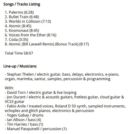 Attachment 2331 ABOUT STEPHAN THELEN .STEPHAN THELEN from official website Stephan Thelen Born May 12th 1959 in Santa Rosa, California, USA. He lives and works in Zürich, Switzerland as a musician, composer, producer and mathematician. Education: Studies in classical guitar; Guitar Craft Seminars with Robert Fripp (founder and guitarist of King Crimson) during the 1990s; studied mathematics at the University of Zürich (PHD in 1990) Musical activities: plays or played guitar and electronics in various bands and ensembles in and around Zürich that concentrate on music at the fringes of rock, jazz, experimental and classical music. (Sonar, Radio Osaka, License to Chill, Broken Symmetry and Root Down). Many CD Productions (No No Diet Bang, Peter Schärli Sextet, etc.). Many Theatre-, Dance- und Filmproductions. Since 2004 he has been concentrating more and more on compositions for modern Classical Chamber Music and since 2010 on work with the minimal-progressive band Sonar. Attachment 2330 These are my best tracks of 2025 Track Title-Group or Artist-Album King Kong-AMPLIFIER-Gargantuan Night Terror-DREAM THEATER-Parasomnia Panopticon -GHOST OF THE MACHINE-Empires Must Fall The End of Days Suite: 1. The City Lights at Twilight -THE JOHN IRVINE BAND-HERE COME THE ROBOTS! Lucifer, Bringer of Light -MOTORSPSYCHO-MOTORSPSYCHO Marvelous World-CHEAT THE PROPHET-Redemption The-Shoreline-EYE 2 EYE-Lost Horizon End of the Road-KARMAKANIC-Transmutation These Hands That Build-BLACK NARCISSUS-There Lingers One Who's Long Forgotten Objects Outlive Us-STEVEN WILSON-The Overview Far From Here-IQ-Dominion Sleeping on a Cloud-LET SEE THIN-Machine Called Life Gone-BJØRN RIIS-Fimbulvinter Deep Water Suite IX-COSMIC CATHEDRAL- Deep Water Another Holy Grail-PATTERN-SEEKING ANIMALS-Friend Of All Creatures Seraphina Moon-CEN-PROJEKT-Carnival Of Lost Souls Demain a l’aube-GERALD MASSOIS- Demain a l’aube -Considerations-THE FLOWER KINGS-Love -The Passing-JACOB ROBERGE-The Passing -Ordinary Gods-KARIBOW-PanTerrania -Division Warning-COSMOGRAF-The Orphan Epoch -De Tre Gratier-Lars Fredrik Froislie-Gamle Mester -Terraforming-AMBIENT DEN-Ambient Den -Fall Away-DAVE BAINBRIDGE-On The Edge (Of What Could Be) -Remnants of Memories-DORACOR-Unexpected Intersections -Insurrection-CRAYON PHASE-Synthetic Mind -The Book of Hours Pt I-AGROPELTER-The Book of Hours -Voice of God-ATOMIC TIME-Subsounds -Atomic -STEPHAN THELEN-WORLDS IN COLLISION Attachment 2333 Attachment 2332 Atomic -STEPHAN THELEN https://stephanthelen.bandcamp.com/track/atomic Palermo-STEPHAN THELEN https://stephanthelen.bandcamp.com/track/palermo GOOD LISTENING |