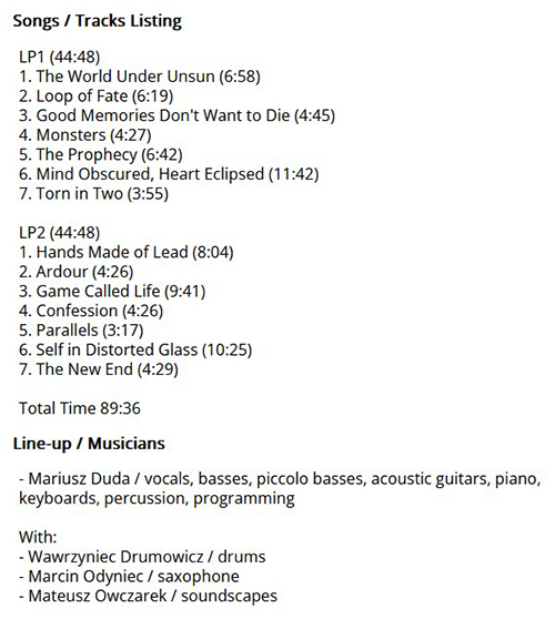 Attachment 2335 LUNATIC SOUL .LUNATIC SOUL from official website Bio Lunatic Soul is the solo outfit of the creator, vocalist, and multi-instrumentalist Mariusz Duda. Duda is best known as the frontman of the Polish progressive rock band Riverside, where he is the main composer, lyricist, vocalist, and bassist. In 2008, he launched a separate outlet in which, as he says himself, he wanted to create something different and uncompromising. Lunatic Soul is inspired by artists such as Dead Can Dance, Peter Gabriel (especially his “Passion” album), Mike Oldfield, Clannad, Hedningarna and Depeche Mode. It’s an attempt to blend ambient music and electronic music with folk and rock influences. Duda plays almost all the instruments himself, with occasional guest appearances from invited musicians. While the artist doesn’t reject the label of progressive rock, he believes that “Lunatic Soul gives me more room for musical originality than Riverside”. For this reason, he doesn’t like Lunatic Soul being referred to as a “side project”. “To me, there’s nothing secondary about Lunatic Soul. Musically and conceptually, it’s an equally important musical world – if not more important. Here, I can do literally anything.” Since its inception in 2008, Lunatic Soul have released seven full-length albums and 2025 will see the release of the 8th album “The World Under Unsun” via Inside Out Music internationally and Mystic Production in Poland. All eight albums form what is known as the “The Circle of Life and Death”, a cohesive story in which a solitary artist-traveller journeys between life and death. Attachment 2338 These are my best tracks of 2025 Track Title-Group or Artist-Album King Kong-AMPLIFIER-Gargantuan Night Terror-DREAM THEATER-Parasomnia Panopticon -GHOST OF THE MACHINE-Empires Must Fall The End of Days Suite: 1. The City Lights at Twilight -THE JOHN IRVINE BAND-HERE COME THE ROBOTS! Lucifer, Bringer of Light -MOTORSPSYCHO-MOTORSPSYCHO Marvelous World-CHEAT THE PROPHET-Redemption The-Shoreline-EYE 2 EYE-Lost Horizon End of the Road-KARMAKANIC-Transmutation These Hands That Build-BLACK NARCISSUS-There Lingers One Who's Long Forgotten Objects Outlive Us-STEVEN WILSON-The Overview Far From Here-IQ-Dominion Sleeping on a Cloud-LET SEE THIN-Machine Called Life Gone-BJØRN RIIS-Fimbulvinter Deep Water Suite IX-COSMIC CATHEDRAL- Deep Water Another Holy Grail-PATTERN-SEEKING ANIMALS-Friend Of All Creatures Seraphina Moon-CEN-PROJEKT-Carnival Of Lost Souls Demain a l’aube-GERALD MASSOIS- Demain a l’aube -Considerations-THE FLOWER KINGS-Love -The Passing-JACOB ROBERGE-The Passing -Ordinary Gods-KARIBOW-PanTerrania -Division Warning-COSMOGRAF-The Orphan Epoch -De Tre Gratier-Lars Fredrik Froislie-Gamle Mester -Terraforming-AMBIENT DEN-Ambient Den -Fall Away-DAVE BAINBRIDGE-On The Edge (Of What Could Be) -Remnants of Memories-DORACOR-Unexpected Intersections -Insurrection-CRAYON PHASE-Synthetic Mind -The Book of Hours Pt I-AGROPELTER-The Book of Hours -Voice of God-ATOMIC TIME-Subsounds -Atomic -STEPHAN THELEN-WORLDS IN COLLISION -The Prophecy -LUNATIC SOUL-THE WORLD UNDER UNSUN Attachment 2336 Attachment 2337 The Prophecy-LUNATIC SOUL https://insideoutmusic.bandcamp.com/track/the-prophecy Loop of Fate-LUNATIC SOUL https://insideoutmusic.bandcamp.com/track/loop-of-fate GOOD LISTENING |