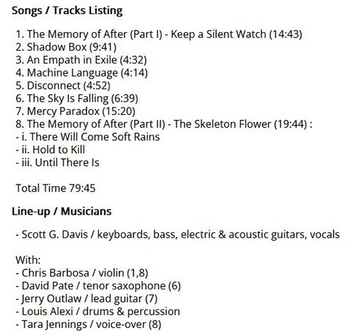 Attachment 2361 ABOUT MYTH OF LOGIC ...MYTH OF LOGIC From Progarchives.com Myth of Logic biography MYTH OF LOGIC is the creative vehicle of Scott G. DAVIS of Saint Petersburg, FL, and is influenced to some extent by progressive rock of all eras, but primarily that of the 1970s, the main influences being stated to include GENESIS, EMERSON LAKE & PALMER, RUSH, KANSAS, YES and SAGA. Back in the early 1990s Scott had a vision of the band he had always wanted, but nothing came of it at the time, so he lived his life, stored his ideas and generally ignored this music. Then in 2021, after much gentle prodding from a friend named Jim BEILMAN, something ignited and the mothballed music and ideas just came pouring back out. Scott had no idea of the cause or the source of this sudden inspiration. The debut album 'Surrounded By Ghosts' is thus the first chapter of an intended trilogy called 'Here & There', and was written and recorded in Saint Petersburg, FL at Boyz Club South Studio and mastered by Alan DOUCHES at West West Side Music. The album follows the story of a guy called Robin, and is one of adventure, discovery and redemption - featuring a man trapped and fighting for his life who must find a way to defeat a seemingly invincible foe and escape from his prison. It was released on CD and all major streaming platforms via Abulia Records on 11th November 2022. The second chapter in the trilogy, 'Pictures From A Previous Dream' was soon to follow, being released just over a year later on 31st December 2023, again via Abulia Records, and following the story of Robin as his adventure continues. The third chapter in the story is also currently at the beginning of 2024 already half written. Attachment 2360 These are my best tracks of 2025 Track Title-Group or Artist-Album King Kong-AMPLIFIER-Gargantuan Night Terror-DREAM THEATER-Parasomnia Panopticon -GHOST OF THE MACHINE-Empires Must Fall The End of Days Suite: 1. The City Lights at Twilight -THE JOHN IRVINE BAND-HERE COME THE ROBOTS! Lucifer, Bringer of Light -MOTORSPSYCHO-MOTORSPSYCHO Marvelous World-CHEAT THE PROPHET-Redemption The-Shoreline-EYE 2 EYE-Lost Horizon End of the Road-KARMAKANIC-Transmutation These Hands That Build-BLACK NARCISSUS-There Lingers One Who's Long Forgotten Objects Outlive Us-STEVEN WILSON-The Overview Far From Here-IQ-Dominion Sleeping on a Cloud-LET SEE THIN-Machine Called Life Gone-BJØRN RIIS-Fimbulvinter Deep Water Suite IX-COSMIC CATHEDRAL- Deep Water Another Holy Grail-PATTERN-SEEKING ANIMALS-Friend Of All Creatures Seraphina Moon-CEN-PROJEKT-Carnival Of Lost Souls Demain a l’aube-GERALD MASSOIS- Demain a l’aube -Considerations-THE FLOWER KINGS-Love -The Passing-JACOB ROBERGE-The Passing -Ordinary Gods-KARIBOW-PanTerrania -Division Warning-COSMOGRAF-The Orphan Epoch -De Tre Gratier-Lars Fredrik Froislie-Gamle Mester -Terraforming-AMBIENT DEN-Ambient Den -Fall Away-DAVE BAINBRIDGE-On The Edge (Of What Could Be) -Remnants of Memories-DORACOR-Unexpected Intersections -Insurrection-CRAYON PHASE-Synthetic Mind -The Book of Hours Pt I-AGROPELTER-The Book of Hours -Voice of God-ATOMIC TIME-Subsounds -Atomic -STEPHAN THELEN-WORLDS IN COLLISION -The Prophecy -LUNATIC SOUL-THE WORLD UNDER UNSUN -Aragorn (Extended Version) (Bonus Track) -YAK-THE PINK MAN & THE BISHOP -Everywhere I Rest My Head the Ground is Shifting -The Black Cat's Eye-DECRYPTING DREAMS OF WEIRD ANIMALS AND STRANGE OBJECTS -Last Letter Home -HOOFFOOT-PHANTOM LIMB -Tesselate-SMALLTAPE-TANGRAM -Long Shadows-HEAD SPIN-High Orbit -Keep a Silent Watch-MYTH OF LOGIC-The Memory Of After Attachment 2362 Attachment 2364 Keep a Silent Watch-MYTH OF LOGIC https://www.youtube.com/watch?v=uB9G...tart_radio =1 GOOD LISTENING |