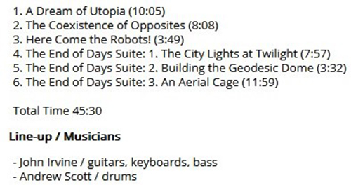 Attachment 2199 ABOUT THE JOHN IRVINE BAND ...THE JOHN IRVINE BAND From Official Website I initially trained as a classical guitarist, studying at Dartington College of Arts for two years after leaving school, and then at the Royal Scottish Academy Of Music & Drama (Glasgow) where I studied with Phillip Thorne, gaining a BA in Music Performance (1989) and winning the Guitar Challenge Prize (1988). Following a Post-Grad Certificate in Performance (1990), I began a PhD in music composition, with Nigel Osborne at the University of Edinburgh, in 1992. This was completed in 1999. At this time, I was also working in Scottish theatre where I wrote music for over 40 productions, 20 of which were for the Traverse Theatre (Edinburgh). I have taught at St Mary’s Music School (Edinburgh) and The City of Edinburgh Music School and lectured at Edinburgh Napier University, where I was asked to redesign their ‘Music, Creativity & Communication’ course for the BA in Popular Music. I currently work as a PSA in Edinburgh Schools. I’m the author of three sci-fi novels comprising ‘The Smith Chronicles’ series of books, and I’m also a published poet and short-story writer, having had works included in several journals and web-zines such as Poetry Scotland, The Open Mouse, Blinking Cursor, Essence, Ink, Sweat & Tears, A Handful of Stones, South and Streetcake Magazine, amongst others. I formed The John Irvine Band in 2011… about "HERE COME THE ROBOTS!" The 8th John Irvine Band album is the final part of the 'End of Days' trilogy of progressive jazz-rock concept albums The album pays homage to the Greek musician and composer Vangelis Papathanassiou, who died in 2022 Mastered by Andrew Rankine at Black Cave Recordings, Edinburgh Mixed by John Irvine at JIB Headquarters Drums recorded by Andrew Scott at Owl Shed Studios, Edinburgh Artwork by Sam Hayles at DOSEprod Graphic Design Studio Attachment 2198 Hi friends 2025 Work in Progress..ive These are my best tracks of 2025 Track Title-Group or Artist-Album King Kong-AMPLIFIER-Gargantuan Night Terror-DREAM THEATER-Parasomnia Panopticon -GHOST OF THE MACHINE-Empires Must Fall The End of Days Suite: 1. The City Lights at Twilight -THE JOHN IRVINE BAND-HERE COME THE ROBOTS! Attachment 2200 Attachment 2201 The End of Days Suite: 1. The City Lights at Twilight -THE JOHN IRVINE BAND https://www.youtube.com/watch?v=kyEkLUOKA7I The End of Days Suite: 3. An Aerial Cage -THE JOHN IRVINE BAND https://www.youtube.com/watch?v=pfWpey_0rf8 GOOD LISTENING |