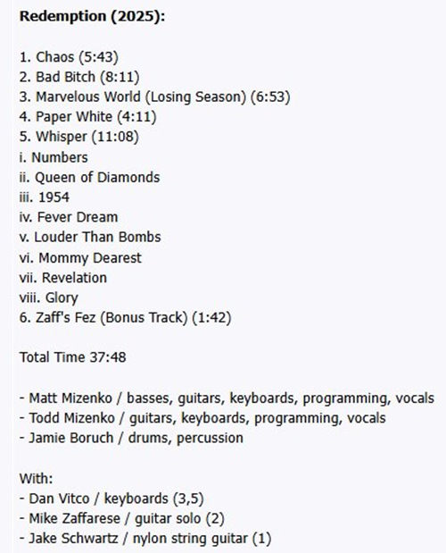 Attachment 2209 ABOUT CHEAT THE PROPHET ...CHEAT THE PROPHET From progarchives.com CHEAT THE PROPHET is a progressive rock project involving the core members of a former band called NEPENTHE, which split up in December 1999 after releasing just a single album in 1997. Multi-instrumentalist brothers Matt and Todd Mikenzo, along with drummer Jamie Boruch, have been making music together for a long time, beginning in the early 1990s with some gigs in the New York/New Jersey club area playing a mix of Euro Pop and Neo Prog under the name ARS NOVA, and releasing an album called 'Turning The Tide' in May 1993, before changing the name of the band to NEPENTHE and releasing an album called 'Everything Was Beautiful and Nothing Hurt' in March 1997. They have been joined by other musicians at various stages of their musical journey - some for longer than others - but the core of the group has remained intact throughout. Just before the turn of the century however, despite some critical success as NEPENTHE, it seemed that commercial success would forever elude the trio, and the stresses of life began affecting them both physically and mentally. Patience and tempers began to wear thin, and they found that the bond they once had as a bunch of twenty-somethings had begun to wane. Despite this, they stayed in touch, saw each other from time to time, and kept making music individually. Then, towards the end of the COVID-19 pandemic, Jamie and Matt met up in Idaho for a weekend of mountain biking, and they decided that many of the changes that had occurred as a result of Covid meant it might be worth them taking another shot at making music together as a trio, despite them living many miles apart from each other. Todd subsequently agreed, leading to the beginnings of what eventually became CHEAT THE PROPHET. Demos and songs in various stages of completion were swapped via Google Drive, and the collection of samples was eventually whittled down down into the basis of just six songs. Two years or so later, the songs were finally finished, which might seem like a long time, but after waiting twenty years to even begin the project in the first place, maybe it wasn't after all. The album was called Redemption firstly because the trio felt to some degree that their final recordings and shows from twenty years earlier weren't as good as they might have been. They also thought that they'd left what was possibly some of their best material unrecorded, and decided it would be a shame to leave those songs unfinished. The 'Redemption' album was released on 7th February 2025. Attachment 2208 Hi friends 2025 Work in Progress..ive These are my best tracks of 2025 Track Title-Group or Artist-Album King Kong-AMPLIFIER-Gargantuan Night Terror-DREAM THEATER-Parasomnia Panopticon -GHOST OF THE MACHINE-Empires Must Fall The End of Days Suite: 1. The City Lights at Twilight -THE JOHN IRVINE BAND-HERE COME THE ROBOTS! Lucifer, Bringer of Light -MOTORSPSYCHO-MOTORSPSYCHO Marvelous World-CHEAT THE PROPHET-Redemption Attachment 2210 Attachment 2211 Marvelous World-CHEAT THE PROPHET https://cheattheprophet.bandcamp.com...-losing-season GOOD LISTENING |