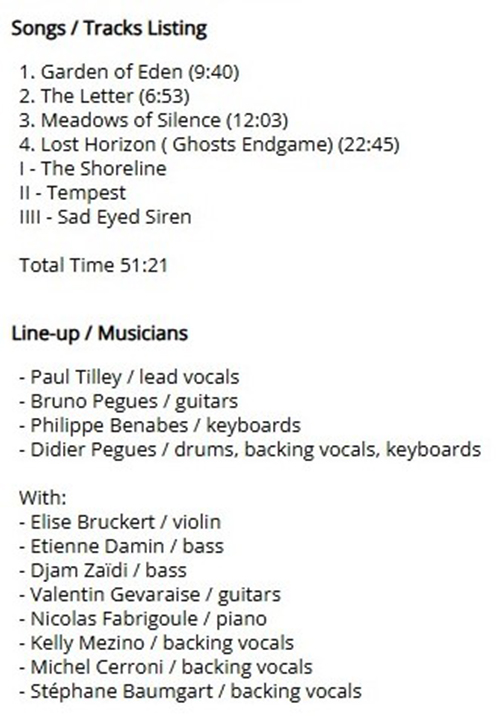 Attachment 2218 ABOUT EYE 2 EYE ...EYE 2 EYE From official website The Story Eye 2 Eye is a French progressive rock group from the Paris area, created by Philippe Bénabès (Keyboards) and Didier Pègues (Drums and Keyboards) at the beginning of 2003, following the dissolution of their previous group, ADN. Three musicians also orphans of their ex-group, Limelight, come to lend them a hand: Benoit Derat (Vocals and guitars), Médéric Colas (Guitars) and Cécile (bass). Médéric Colas quickly left the group for personal reasons and was replaced initially by Bruno Pègues, brother of the drummer then at the beginning of 2004 by Amirouche Ali Benali. The first efforts of the group are based around a cover of a title by David Gilmour, guitarist of Pink Floyd, entitled "Near the End". This piece will be used for a cover album in tribute to Pink Floyd: "None of us is Pink", at the beginning of 2006. During this period, the group is offered to participate in an album in tribute to the Dutch group. Ayreon. Eye 2 Eye decides to cover "Back on Planet Earth", from the album "Actual Fantasy", released in 1996, in a more "ambient" mood than the original track. This same cover will be used on the group's first album, "One in Every Crowd", which will be released on October 26, 2006 at Musea. Benoit Derat and Cécile will leave the group, shortly before the release of this album. In 2007, new compositions were put in place. A new bass player was found in the person of Aymeric Delteil in May, then in December of that same year, Jack Daly became the new singer. Texts are quickly written and recording continues. During 2008, the group, initially called Eye to Eye, was forced to change its surname slightly, following the request of another homonymous group. A version of "You", taken from the first album is re-recorded at the end of the year, with the voice of Jack. "After All ..." was released on February 9, 2009, at Musea. As soon as it left, the group enjoyed glowing reviews. The group will even be named at the Prog Awards in Italy, in the category "Best foreign album". EYE 2 EYE decides to start writing a concept album whose working name is "Wax", on an original idea from Jack. But opinions diverge and finally, Jack decides to leave the training to pursue a solo career. Djamel Zaidi (Leader of Transperception) comes to offer his services to the group in December 2009. EYE 2 EYE decides to continue with the idea of a concept album. They embark on an adaptation of Oscar Wilde's novel: "The Picture of Dorian Gray". In early 2011, this album is being mixed and "The Wish" was released on December 9 of that same year at Musea. Etienne DAMIN replaced Aymeric DELTEIL, late 2011. Djamel Zaidi left the group in May 2012 for other musical projects ... With "The Light Bearer" (Musea, 2017), EYE 2 EYE finally emerges from a silence that lasted five years. The neo-progressive influences of yesteryear are less obvious, to make way for others, more symphonic. The song, now held by Michel CERRONI, turns out to be deep and lyrical, while the arrangements are always more careful. A string quartet also brings something new... The track, initially called "Ghosts" inspired them, and quickly needed a sequel. The title became “Ghosts – Pt.1”, and it was decided the following album will tell the following parts of that story. EYE 2 EYE began to work on it just before the release of “The Light Bearer”, and ideas came quite quickly. But the following year, Michel CERRONI decided to leave the band during July, because of professional obligations. Fortunately, Jack DALY decided to rejoin the band in September. When he heard the demos, he became motivated as never before. From there, the recording sessions continued. Some new guests came to help: Thierry LALET (Feadog) and Claudine ISTRIA (Backing Vocals) from HELIANTHE, and Marie Pascale VIRONNEAU (Violin). The recording sessions finally ended, in the beginning of 2020. The mixing sessions had to begin, when the Covid stopped everything... Etienne DAMIN decided to mix the album in his own new mixing Studio during the spring lockdown. And in the beginning of July, all the tracks were sent to PROGRESSIVE PROMOTION RECORDS in Germany. The Label decided to sign EYE 2 EYE and the Band is proud to tell you the new Album, called “Nowhere Highway” will be released on December the 4th!!.... In the end of 2020, Djam ZAÏDI and Didier PEGUES worked on a brand new version of the long time sold out album "The Wish". They totally remixed and remastered the album, and add some new parts on it. Djam ZAÏDI re-recorded the voices, the Bass parts and the Guitar Parts. The drums were boosted too... On February 2021, this New Album is called "The New Wish", and was re-edited by PROGRESSIVE PROMOTION RECORDS. A brand new album began to be composed and written at the same period... When Jack DALY heard the demos, in the end of 2022, he was enthusiastic. Everything seemed ok... But when the recording sessions started everything went from bad to worse... Jack DALY could not find the time to record his voices, and a few months later, Etienne DAMIN decided to leave the band, in the middle of the recording process, around April of 2023.... EYE 2 EYE had no singer (once again) and no Bassist.... The remaining members tried new singers, but were not really satisfied of the results... Anyway, Elise BRUCKERT came back to put her magical violin on the new tracks, And Djam ZAÏDI accepted to do the lacking bass parts. In the beginning of July 2023, Didier PEGUES talked of that singer problem with a long time Band Friend : Paul "Hilrant" TILLEY. Paul was a long time fan and was on charge to correct the Lyrics since "The Light Bearer". He also has a huge solo career under the name of "HILRANT". He naturally proposed Didier to put his voice on that new album... EYE 2 EYE not only found a singer....They also found an incredible Storyteller as Progressive Rock needs !!!! Paul lives the Lyrics he sings, an