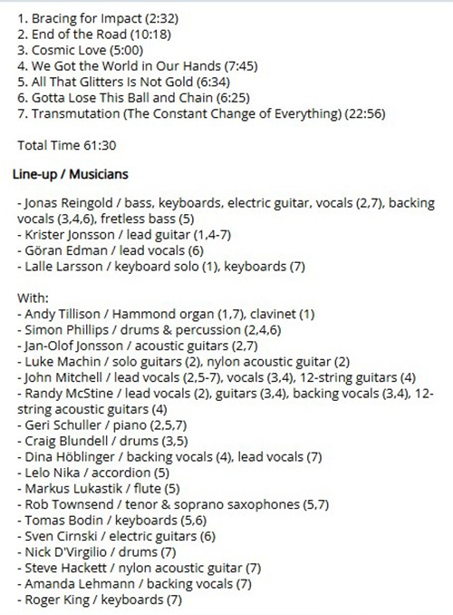 Attachment 2223 ABOUT KARMAKANIC ...KARMAKANIC From Progarchives.com Karmakanic biography Founded in Malmö, Sweden in 2002 THE FLOWER KINGS family, one of the wonders of the world. It seems that nearly every member has his own solo project. But not only solo projects, their members have enough power to take part in projects like THE TANGENT or innumerable other projects. Countless as well are their guest apperances. KARMAKANIC is a kind of solo project from Sweden's finest bass player Jonas REINGOLD. But how could it be any different (anyway we are talking about the FLOWER KINGS), many of his band mates are featured in this project, it seems as if they can't live without each other. KARMAKANIC is one of the better side projects and released two albums so far, "Entering the Spectra" and "Wheel of Life". The difference between these two albums is Roine Stolt's influence. The first one sounds like the FLOWER KINGS with exception of some bass dominated parts. You will get Roine Stolt on vocals and guitar. Unlike "Entering the Spectra" Roine plays a very small role on the new album "Wheel of Life". It sounds more independent and disengages a little from the typical FLOWER KINGS sound, maybe because Roine just plays some guitar parts and Krister Jonzon took over the main guitar work. What both albums have in common is the dominating bass, not really astonishing because we are talking about a project that is led by Jonas Reingold. So if you like the FLOWER KINGS you will love KARMAKANIC, but will also like them if you never heard of the Kings. I recommend to start with the second album "Wheel of Life" because it has not so many similarities to their main project like the first release. : : : Martin Dietrich, GERMANY : : : Attachment 2222 Hi friends 2025 Work in Progress..ive These are my best tracks of 2025 Track Title-Group or Artist-Album King Kong-AMPLIFIER-Gargantuan Night Terror-DREAM THEATER-Parasomnia Panopticon -GHOST OF THE MACHINE-Empires Must Fall The End of Days Suite: 1. The City Lights at Twilight -THE JOHN IRVINE BAND-HERE COME THE ROBOTS! Lucifer, Bringer of Light -MOTORSPSYCHO-MOTORSPSYCHO Marvelous World-CHEAT THE PROPHET-Redemption The-Shoreline-EYE 2 EYE-Lost Horizon End of the Road-KARMAKANIC-Transmutation Attachment 2224 Attachment 2225 End of the Road-KARMAKANIC https://www.youtube.com/watch?v=MAavyLQTMrE Cosmic Love-KARMAKANIC https://www.youtube.com/watch?v=RQjzF3IzAMU GOOD LISTENING |