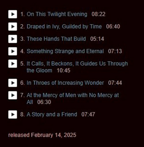 Hi friends 2025 Work in Progress..ive The best tracks of 2025 as new albums come out one track per band or artist... which can change over the course of 12 months and which can also be replaced by better tracks from other artists at the end of the year it will be easier to create favorite playlist of 2025 the year should start off well with albums of some substance with Dream Theater, IQ, Lunatic Soul, Steven Wilson,Jethro Tull provided they don't move the release of their albums |