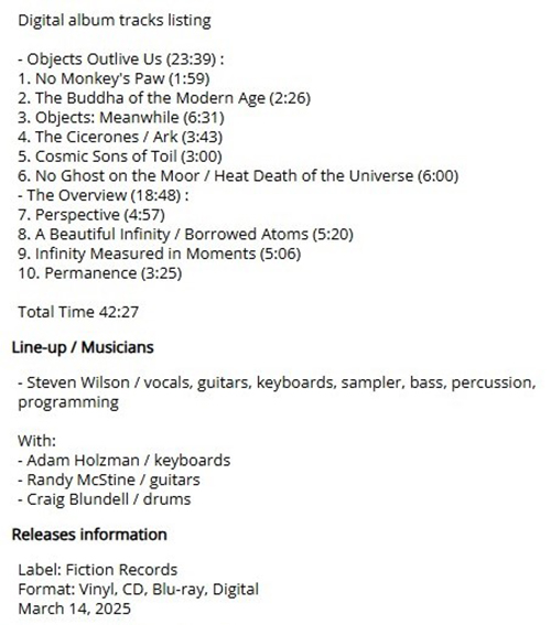 Attachment 2231 ABOUT "The Overview" the inspiration for Steven Wilson's new album started from the Overwiew effect that astronauts have once they find themselves observing the infinite immensity of the universe and you understand how irrelevant we are and how unstable our presence can be and instead of enjoying the fortune of this passage .... on earth the populations spend most of their time waging wars and other things ... the same meaning of the Overwiew effect I have always wanted to insert it in the background of my Work in Progress..ive without ever having been an astronaut ..... never put a Wilson album on the turntable thinking you know in advance what you could expect ... the personified eccentricity and a creativity that has few equals in the progressive scene will always make you get your feelings wrong ... The Overview is the classic album that should be listened to several times and is made up of two suites of 23'.17'' and 18'.27'' I like them both my first listening didn't give me positive feelings... now the more I listen to it the more I like it... then I have a particular preference for the suites and long tracks Well done Steve STEVEN WILSON ...STEVEN WILSON From Progarchives.com Steven Wilson biography Steven John Wilson - Born 3 November 1967 (Kingston upon Thames, London, UK) STEVEN WILSON, perhaps most widely known for his role as the frontman for the popular act PORCUPINE TREE , is an artist from the UK who, through his various side projects, has spanned a vast number of musical ideas and concepts. Some of the styles he has been known to utilize are heavy prog, psychedelic, electronica, post-rock, ambient music, drone, metal, and art rock. Furthermore, WILSON is intensely focused on production values, dynamic mixing and mastering, and all other sorts of building albums that sound best in high-quality systems. In short, WILSON has always been an artist that appeals to audiophiles and fans of meticulously produced music. This shows up strongly in each of his bands and projects, but it plays even more of a role in his solo efforts. Though some of his earliest musical recordings were demos that predated even Porcupine Tree, his solo releases did not truly start appearing until his "Cover Version" singles began in 2003. Essentially releasing one a year, each "Cover Version" contained a particularly unconventional song that WILSON chose to reproduce and one original song by WILSON. Also, in 2004, WILSON put out his experimental electronic album "Unreleased Electronic Music Vol. 1." Neither the "Cover Version" singles nor "Unreleased Electronic Music" feature any other performers, aside from some input from THEO TRAVIS on the latter. That trend changed at the end of 2008, however, when WILSON released his first full-length, proper solo album, "Insurgentes." Featuring, among others, PORCUPINE TREE drummer Gavin Harrison, Prog bass legend TONY LEVIN, current DREAM THEATER keyboardist JORDAN RUDESS, and saxophonist/flautist THEO TRAVIS, "Insurgentes" proves rather quickly that it is not simply another ambient or electronic release. Toying with many of the styles that can be seen in PORCUPINE TREE, "Insurgentes" is a mature, laid-back album marked by less metal and more noise than PT's later albums. WILSON has stated that the album draws a lot of influence from shoe gazer, post-punk, and drone music. Essentially, before "Insurgentes," WILSON used his solo moniker for a final catch-all for some of his music, making it difficult to draw comparisons to other bands. Nevertheless, "Insurgentes" makes it possible to site some bands with similar sound. Of notable similarity or inspiration are RADIOHEAD, JOY DIVISION, GODSPEED YOU! BLACK EMPEROR, THE MARS VOLTA, and other WILSON projects such as BASS COMMUNION and PORCUPINE TREE. thanks to Spence (LiquidEternity) for the biography Attachment 2230 Hi friends 2025 Work in Progress..ive These are my best tracks of 2025 Track Title-Group or Artist-Album King Kong-AMPLIFIER-Gargantuan Night Terror-DREAM THEATER-Parasomnia Panopticon -GHOST OF THE MACHINE-Empires Must Fall The End of Days Suite: 1. The City Lights at Twilight -THE JOHN IRVINE BAND-HERE COME THE ROBOTS! Lucifer, Bringer of Light -MOTORSPSYCHO-MOTORSPSYCHO Marvelous World-CHEAT THE PROPHET-Redemption The-Shoreline-EYE 2 EYE-Lost Horizon End of the Road-KARMAKANIC-Transmutation These Hands That Build-BLACK NARCISSUS-There Lingers One Who's Long Forgotten Objects Outlive Us-STEVEN WILSON-The Overview Attachment 2232 Attachment 2233 Objects Outlive Us-STEVEN WILSON https://www.youtube.com/watch?v=5P3Ukihr7iQ GOOD LISTENING |