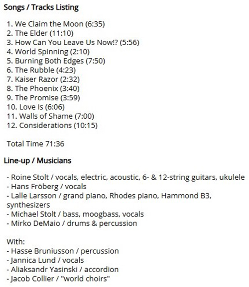 Attachment 2267 ABOUT THE FLOWER KINGS ..THE FLOWER KINGS from official website Biography The Flower Kings A brief history They are regarded by many as one of the leading, if not THE leading, progressive rock outfit of the new millennium. The Flower Kings are led by progrock icon, guitarist, vocalist, composer, producer Roine Stolt into a world of unlimited musical fantasy and flair. Playing it's first ever live date in August 1994 as a result of the interest in Stolt's solo album "The Flower King", the band quickly became somewhat of a phenomenon in the progressive rock community for everyone that once loved bands like Pink Floyd, Genesis, Zappa, UK, Utopia, Yes, ELP, King Crimson or Focus. The band quickly finished the first proper band recording "Back In The World Of Adventures" released 1995 on it's own label "Foxtrot Records" and played shorter tours in Europe the same year, the ball started rolling...just a bit. Building on the success of albums like "Retropolis" & the already classic double CD's "Stardust We Are" and "Flower Power" they toured Europe, Japan & South America and started to build a worldwide following. Successful tours resulted in the recording of the live album, "Alive On Planet Earth", which was compiled from shows in both the USA and Japan -98 & -99. It shows the essence of the textural and emotional offering that is now the trademark of The Flower Kings and shows that this is a band that probably has as much in common with Mozart, Debussy, Andrew Lloyd Webber or Miles Davis as with Pink Floyd, Beatles, Bowie or Yes. There is always an element of soulfulness and drama and the richness of moods and inventiveness has to be heard to be believed. Flower Kings signed to German label in 1999. Roine Stolt is keeping himself busy with numerous sideprojects around the world like TransAtlantic (alongside Mike Portnoy, Neal Morse & Pete Trewavas), plus the reunion of Swedish progrockers KAIPA, his 70's band, Another one is he new highly acclaimed "Tangent" CD featuring Van Der Graaf Generator saxman David Jackson and the obscure "Flying Food Circus" project. With the albums "Space Revolver" 2000 and "The Rainmaker" released in September 2001 The Flower Kings sound shifted to a more accessible level but maintains all the elements that have established this band as one of those most colourful exponents of progressive rock in the world today. In November 2002 Flower Kings released yet another astonishing and adventurous musical statement : "Unfold The Future". A double CD containing everything from classic symphonic rock in pure 70's fashion ( read Yes, Crimson, ELP, Genesis) to weird Zappaesque or Miles Davis like early 70's fusion, there's even the odd pop song. Flower Kings are no simple copycats that merely try to relive the glorious 70's, they rather fuse their sound with a remarkable knowledge of their past but still containing elements contemporary music and of all music history, still looking into the future, always ready to point out new directions and new possibilities, where to take progrock next, always ready to take risks !!! With this comes of course a healthy portion of criticism from the more conservative progfan or prog metal lovers, but Flower Kings still go the way they find most fruitful and rewarding and taylored to stand the test of time, may it be pop or experiment. Not unlike bands like, Phish or Greatful Dead, by incorporating jamming and new twists to every show Flower Kings have built a devoted fanbase of "Flowerheads"that follow them all over the globe, Europe, USA, Japan, Canada, South America. There even seem to be an element of what is "more than music" a way of life that resound the positive music and thoughtful lyrics. Depending more on the soulful elements Flower Kings have left audiences raving for weeks about what seemed to be a highlight of their concertgoing life, EVER !!! With a relatively fresh rhythm section of Hungarian prodigy Zoltan Csorsz and bass madman Jonas Reingold and also presenting labelmates "Pain Of Salvation's " Daniel Gildenlow as a keys, guitar, percussion and vocal sideman together with frontline; leadsinger / guitarist Roine Stolt, keyboardist Tomas Bodin and guitarist /leadsinger Hasse Fröberg they did all embark on the initial leg of a European tour in Nov 2002. Since then they have all continued to florish and blossom in the most spectacular ways, doing another USA tour in June 2003, playing a memorable set at the No.1 US progrock festival "Nearfest". October 2003 saw them embark on the "part 2" of Unfold The Future Tour in conjunction with the release of their first DVD and a Live CD titled "Meet The Flower Kings". The DVD have done remarkably well for the band and there are already plans for another DVD, focusing on interviews with all bandmembers and live sequences of the non-epic songs. A new CD, ADAM & EVE is in the finishing stages for release in July 2004, followed by a European tour. In the meantime everyone in the band keep busy with side projects including a new Tangent CD a new Karmakanic CD "wheel Of Life" and a new project including Roine Stolt and drummer Doane Perry(Jethro Tull), vocalist and bassman Ellis Hall(Tower Of Power/Ray Charles) and keyboardist & LA movie soundtracker Vince DiCola. A new CD by the group "Swedish Family" led by Tomas Bodin is in the making for release late summer 2004, a record of 70's prog inspired by Swedish folkmusic................. Attachment 2266 These are my best tracks of 2025 Track Title-Group or Artist-Album King Kong-AMPLIFIER-Gargantuan Night Terror-DREAM THEATER-Parasomnia Panopticon -GHOST OF THE MACHINE-Empires Must Fall The End of Days Suite: 1. The City Lights at Twilight -THE JOHN IRVINE BAND-HERE COME THE ROBOTS! Lucifer, Bringer of Light -MOTORSPSYCHO-MOTORSPSYCHO Marvelous World-CHEAT THE PROPHET-Redemption The-Shoreline-EYE 2 EYE-Lost Horizon End of the Road-KARMAKANIC-Transmutation These Hands That Build-BLACK NARCISSUS-There Lingers One Who's Long Forg