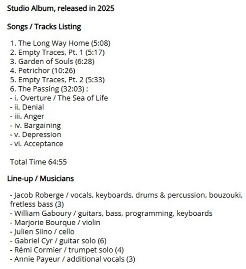 Attachment 2271 ABOUT JACOB ROBERGE ..JACOB ROBERGE from progarchives.com Jacob Roberge biography Jacob Roberge is a Québec-based progressive rock musician, singer, songwriter, composer, arranger, and multi-instrumentalist with a background in classical music and orchestration. His work is rooted in the Symphonic Prog tradition, characterized by grand compositions, orchestrations, and instrumental passages. Roberge initially gained recognition through his YouTube channel, where he showcased his vocal and instrumental talents with covers of artists such as Queen and Genesis. His classical influences are evident in his arrangements and cinematic production, blending rock instrumentation with orchestral elements. On January 31, 2025, Roberge released his debut album, The Passing, a six-track symphonic rock odyssey spanning approximately one hour, including the title track epic at 32 minutes. The album features a full sonic palette, incorporating strings (violin, cello), brass (trumpet), and layered harmonies. His music blends orchestral movements with progressive rock complexity, evoking influences from Genesis, Yes, The Enid, Transatlantic, and Änglagård, yet with a modern, cinematic approach. Bio written by ProgRadio Attachment 2270 These are my best tracks of 2025 Track Title-Group or Artist-Album King Kong-AMPLIFIER-Gargantuan Night Terror-DREAM THEATER-Parasomnia Panopticon -GHOST OF THE MACHINE-Empires Must Fall The End of Days Suite: 1. The City Lights at Twilight -THE JOHN IRVINE BAND-HERE COME THE ROBOTS! Lucifer, Bringer of Light -MOTORSPSYCHO-MOTORSPSYCHO Marvelous World-CHEAT THE PROPHET-Redemption The-Shoreline-EYE 2 EYE-Lost Horizon End of the Road-KARMAKANIC-Transmutation These Hands That Build-BLACK NARCISSUS-There Lingers One Who's Long Forgotten Objects Outlive Us-STEVEN WILSON-The Overview Far From Here-IQ-Dominion Sleeping on a Cloud-LET SEE THIN-Machine Called Life Gone-BJØRN RIIS-Fimbulvinter Deep Water Suite IX-COSMIC CATHEDRAL- Deep Water Another Holy Grail-PATTERN-SEEKING ANIMALS-Friend Of All Creatures Seraphina Moon-CEN-PROJEKT-Carnival Of Lost Souls Demain a l’aube-GERALD MASSOIS- Demain a l’aube - Considerations-THE FLOWER KINGS-Love -The Passing-JACOB ROBERGE-The Passing Attachment 2272 Attachment 2273 The Passing-JACOB ROBERGE https://www.youtube.com/watch?v=7O_4XRnCudM GOOD LISTENING |
