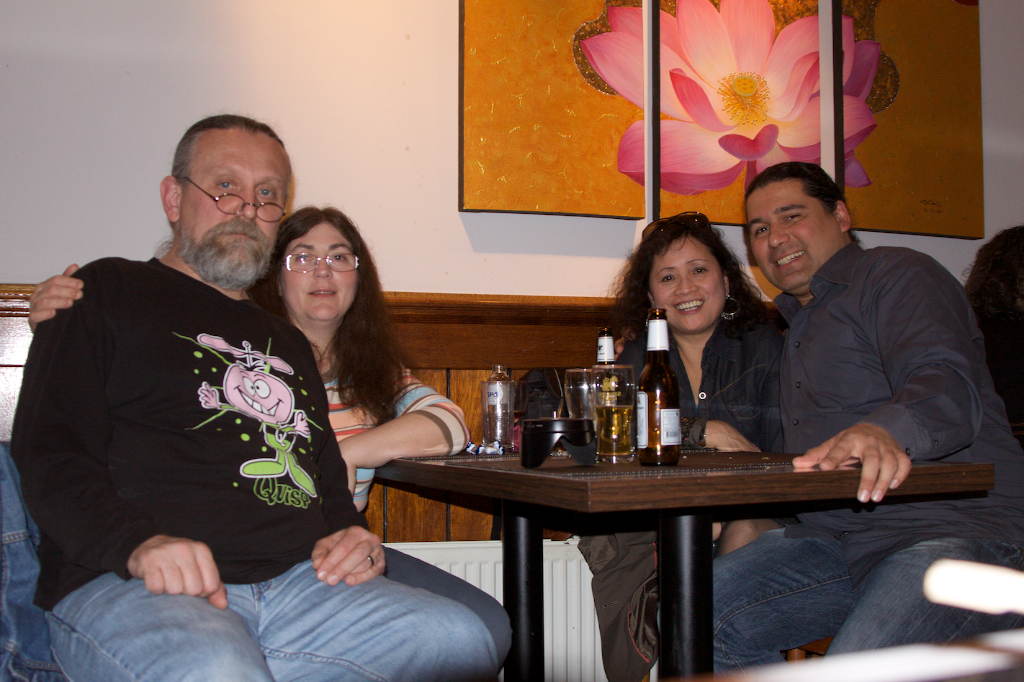 We'd decided on Thai for dinner and, after walking about to several Thai restaurants, we settled into one which, after entering, I realized was one I'd eaten in on a previous visit to A'dam. A group photo taken in the restaurant is attached. After dinner, we ventured to an Irish pub for several more pints of "G-juice." However, our long journey, jet-lag and lack of sleep too soon had us parting ways. I would have loved to spend a few more hours but just couldn't muster the energy to stay vertical.
