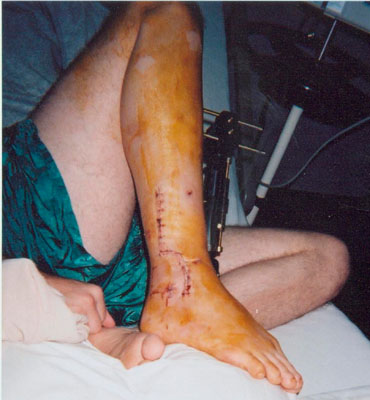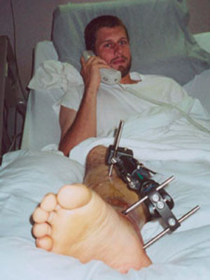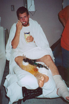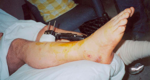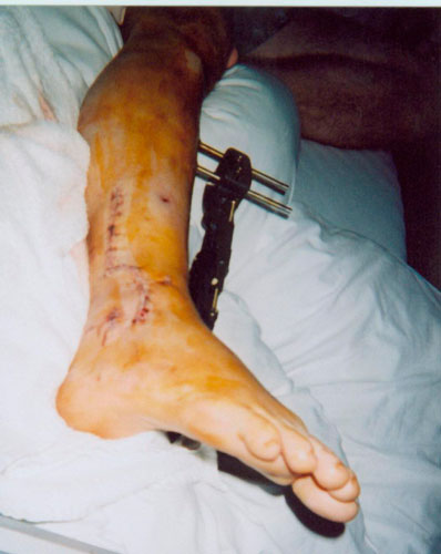 My first surgery was stabalization. I have a $12,500 piece of titanium in my leg. My second surgery included putting three screws in my ankle. The ankle is like the skull: it's a bunch of bones that are fused together. The pressure of the fall made it split on the seems, thus the screws. Also, they put in a plate and four screws on my fibula. As for the tibia, it's a spiral fracture. Have you ever seen a tree with a spiral break because a tornado twisted the top of it? Well that's the way my leg broke. The pieces are too small to piece together, so they stabalized my leg and let a hematoma form around the chunks. After it calcifies into a bone fragment, they will take the fixator out and put a plate from my knee to my ankle, connecting the good part of the tibia to the hematoma to the ankle. That'll take about ten screws. Here are some photos. Bear with me because I'm going to post a bunch and make comments.