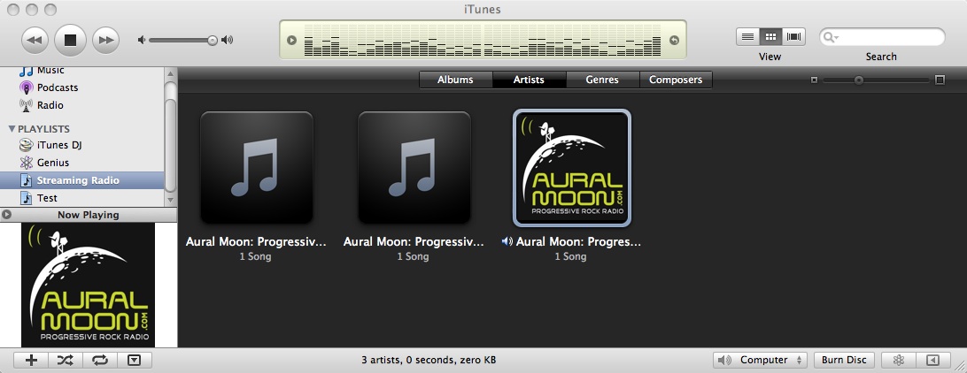 10.5.7 (intel) iTunes 8.2. The behavior is this: It seems that there's a facility to allow the album art to change dynamically to reflect the album playing on the stream. Thus, while the stream is playing [providing the art drawer is showing 'currently playing' and not 'selected item'] the drag target is presented. When the next ID comes along in the stream the art gets associated with it and appears in the view. Under many circumstances the last dragged art is retained. This is probably a bug - since, I guess, the art should relate to the currently playing album and not the source. Anyway a large variety of actions - often including changing the view type cause the art to be cleared back to empty. For example, stopping the stream and then changing from the radio playlist to another and back clears it every time I've tried. There might be some subtle additional action or description that you've attached to the source that changes this behavior - but that's what I find with a stream added to iTunes with default options. I suppose that if we embedded the station logo in the stream ID tags (if that's even possible, with SAM) it might work - but there's a risk that some players might barf on that....